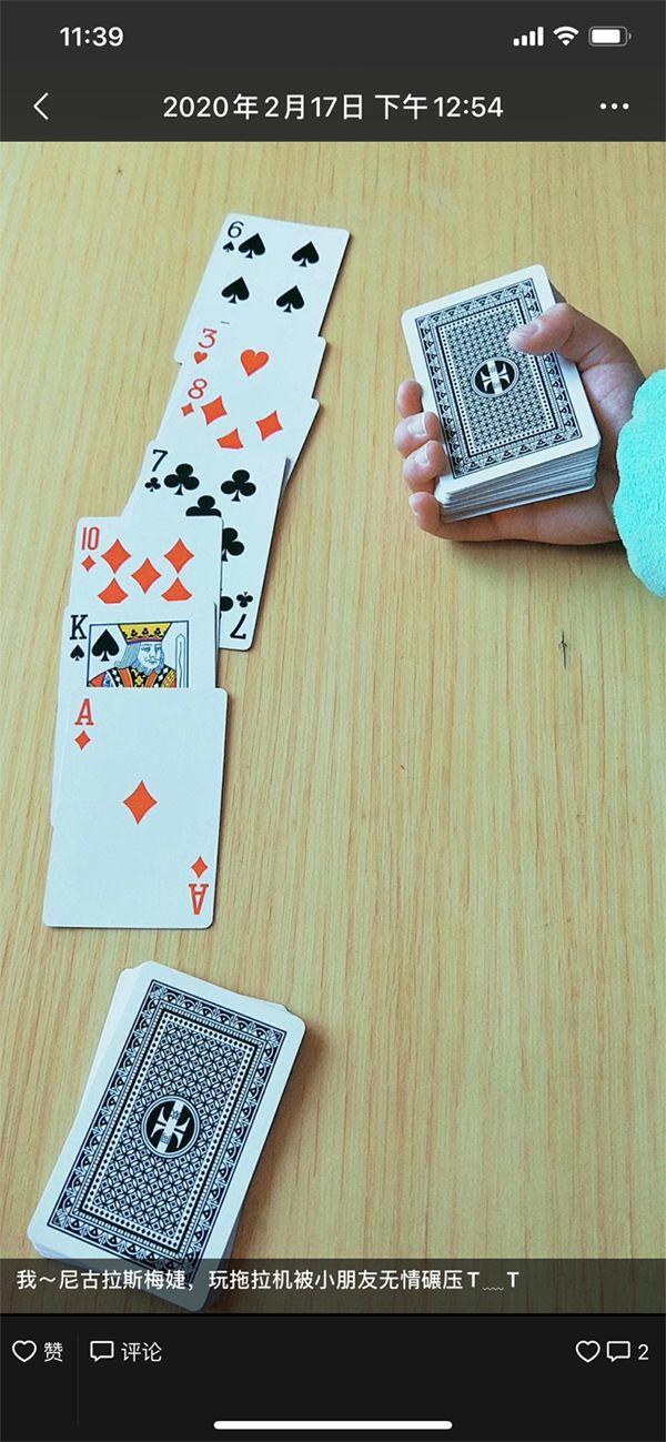 她跟侄子玩一種叫“拖拉機”的牌類游戲。按順序排列出牌,只要一張牌跟之前的數(shù)字相同,就可以收走紙牌,直到對方的牌耗完為止,“我~尼古拉斯梅婕,玩拖拉機被小朋友無情碾壓(哭臉表情)”深夜,她發(fā)了一條朋友圈。