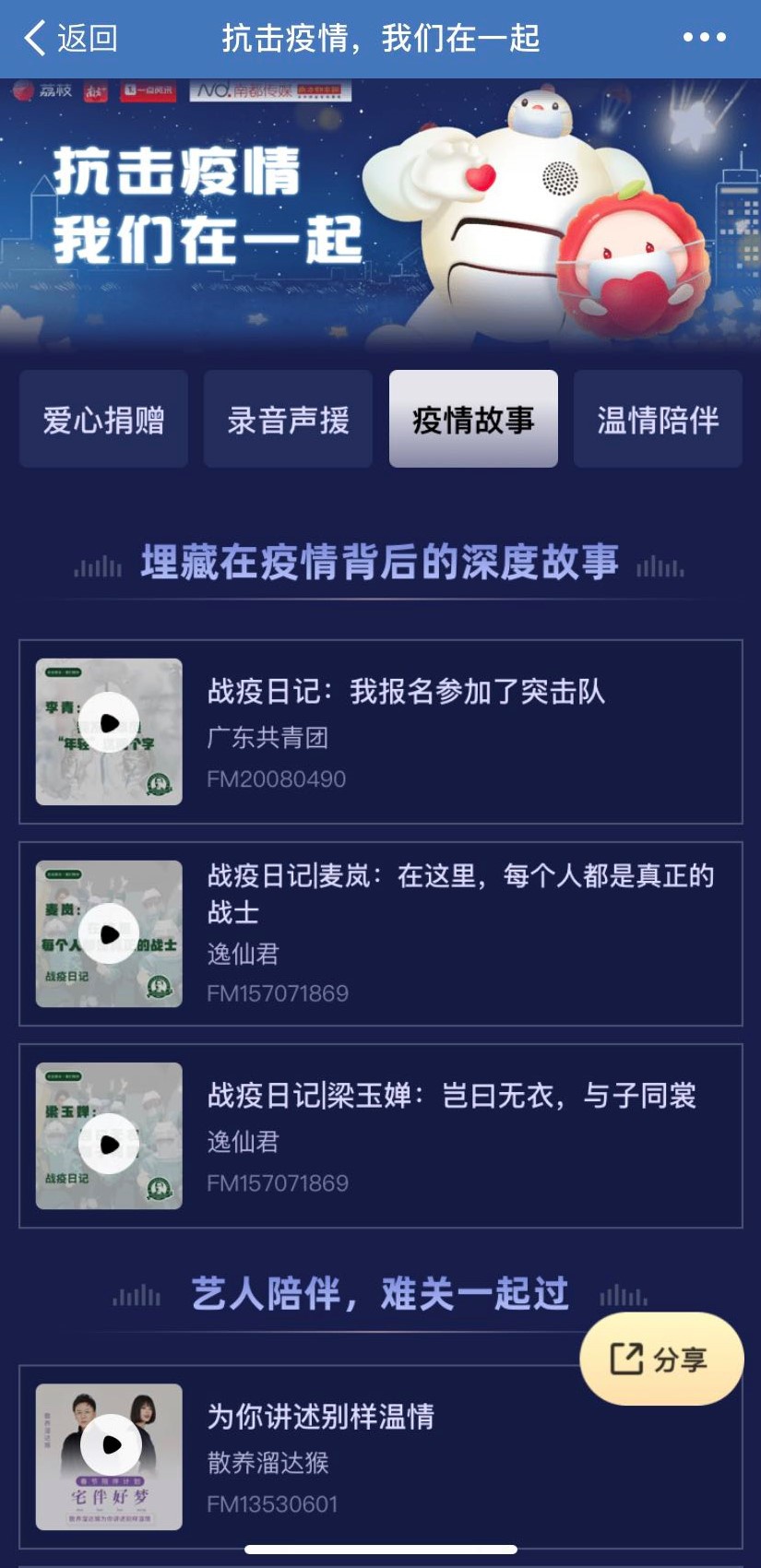 1月28日起,荔枝便在App首頁(yè)上線了“抗擊疫情,我們?cè)谝黄?rdquo;專題,同時(shí)號(hào)召平臺(tái)內(nèi)主播積極參與專題活動(dòng)。其中,包括迪哥、短發(fā)桃子、兒童睡前故事精選、情天、沐陽(yáng)、蘇木、肖奈、優(yōu)秀女紙必修課等荔枝優(yōu)質(zhì)頭部主播紛紛響應(yīng)。