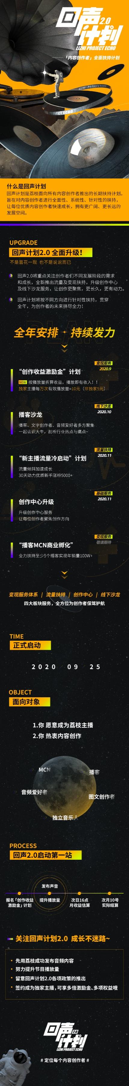 就是這個九月,我們面向所有內容創作者:只要你有內容創作能力,且愿意將內容轉化為音頻成為播客;無論你是播客、圖文創作者、音頻愛好者、MCN等,只要你愿意入駐荔枝,只要你熱衷內容創作,即可參與「回聲計劃2.0」。